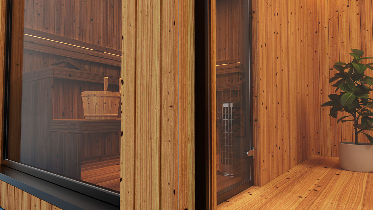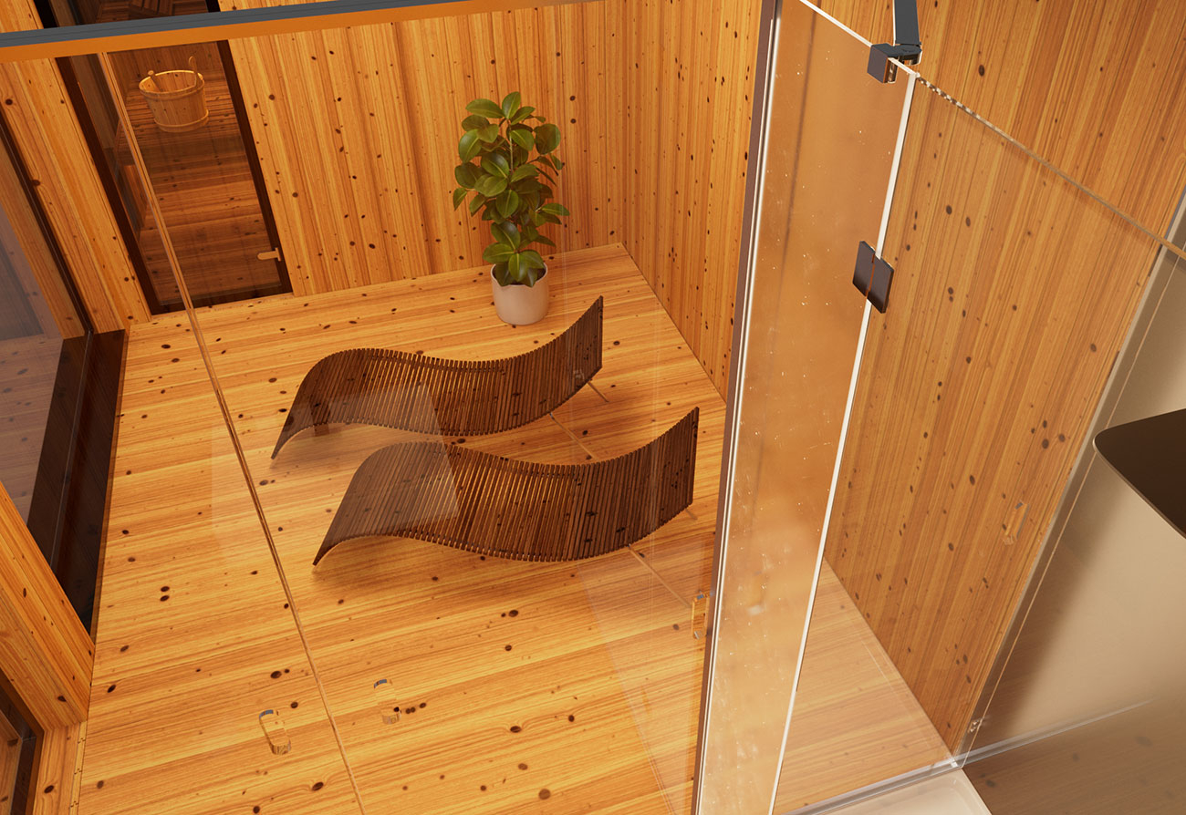 Nejvyšší úroveň komfortu a soukromí. Tato varianta přináší kompletní wellness řešení – saunu, odpočinkovou místnost i plnohodnotnou koupelnu v jednom celku. Díky vlastní sprše a zázemí není potřeba nic řešit ani plánovat. Můžete plynule přecházet mezi jednotlivými fázemi saunování přesně tak, jak to má být – zahřátí, ochlazení, odpočinek. Ideální řešení pro náročnější uživatele i větší rodiny.